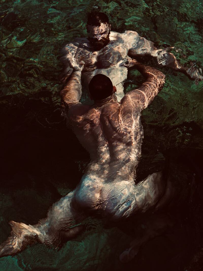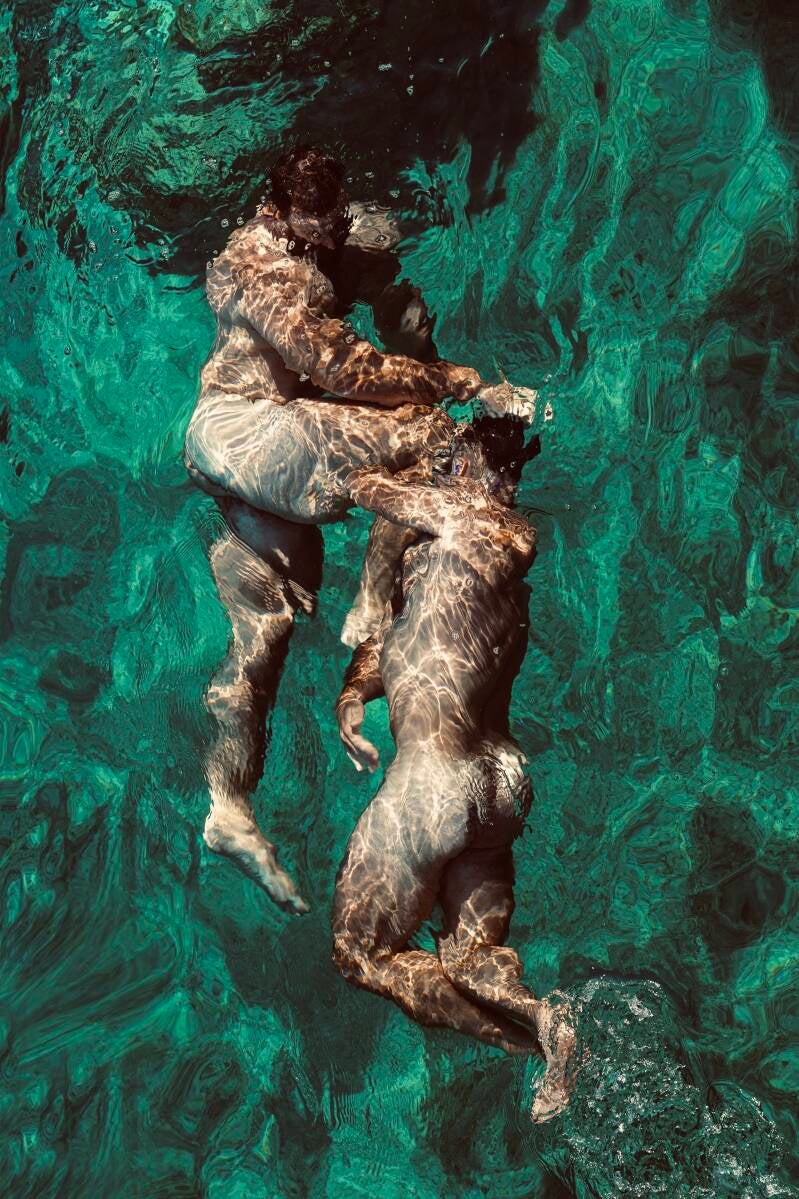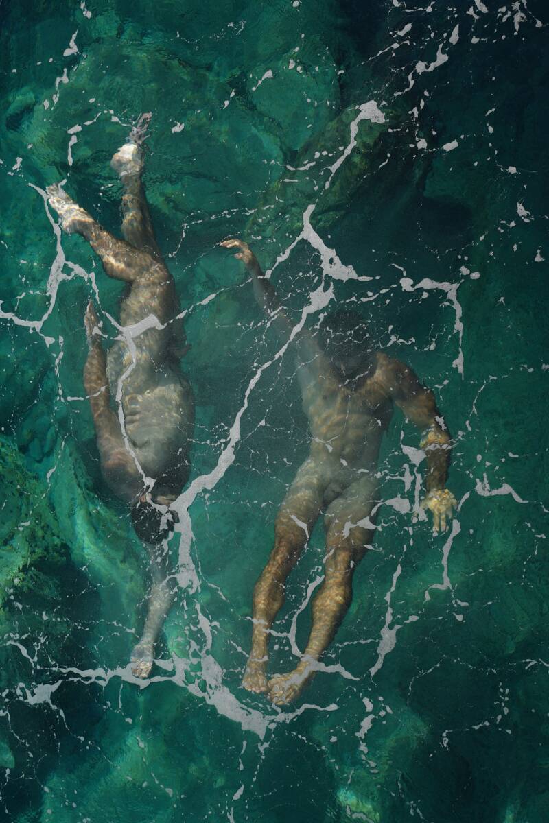 Gefotografeerd in de zee—waar lichamen drijven en de tijd vertraagt—roepen deze beelden tijdloze mythen op: Achilles & Patroklos, Apollo & Hyacinthus, Zeus & Ganymedes.